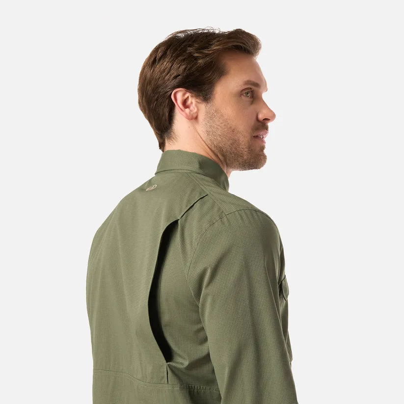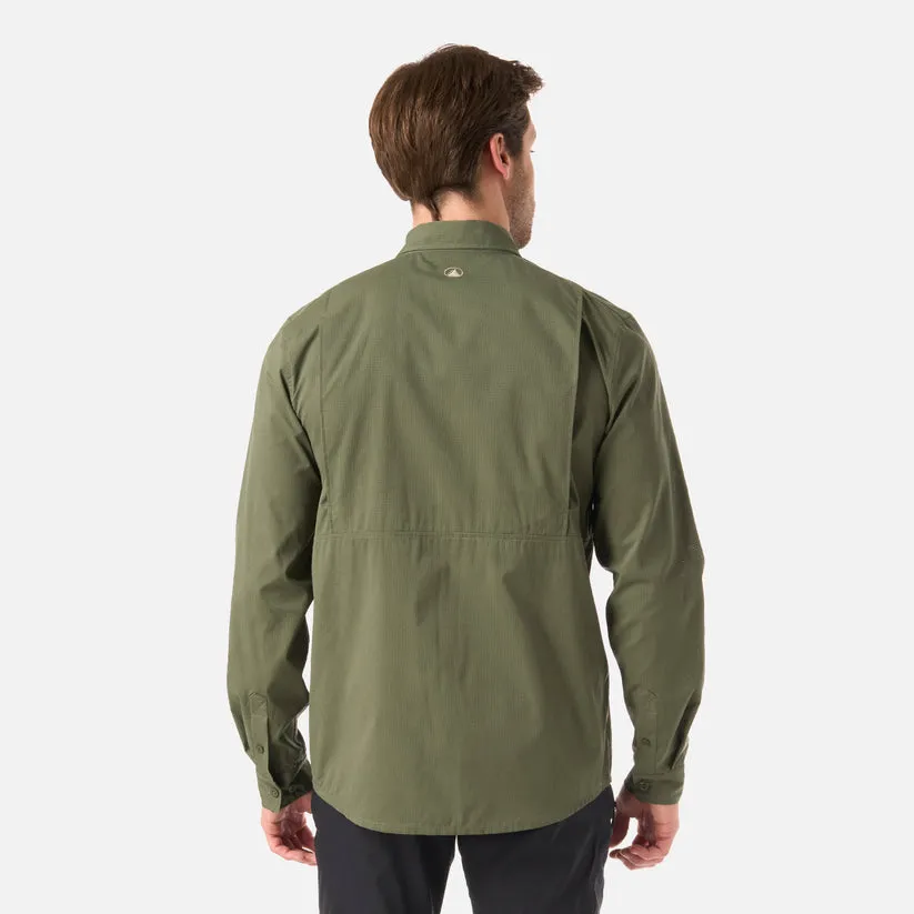 Pensada para días largos al aire libre, esta camisa de manga larga ofrece frescura, comodidad y funcionalidad en cada movimiento. Su tela de poliéster reciclado es liviana y de secado rápido, ideal para climas cálidos o rutas con exposición al sol. La espalda ventilada y los bolsillos en el pecho suman practicidad y ventilación extra, manteniéndote seco y cómodo durante toda la jornada. Perfecta para avanzar con ligereza, incluso cuando el calor aprieta