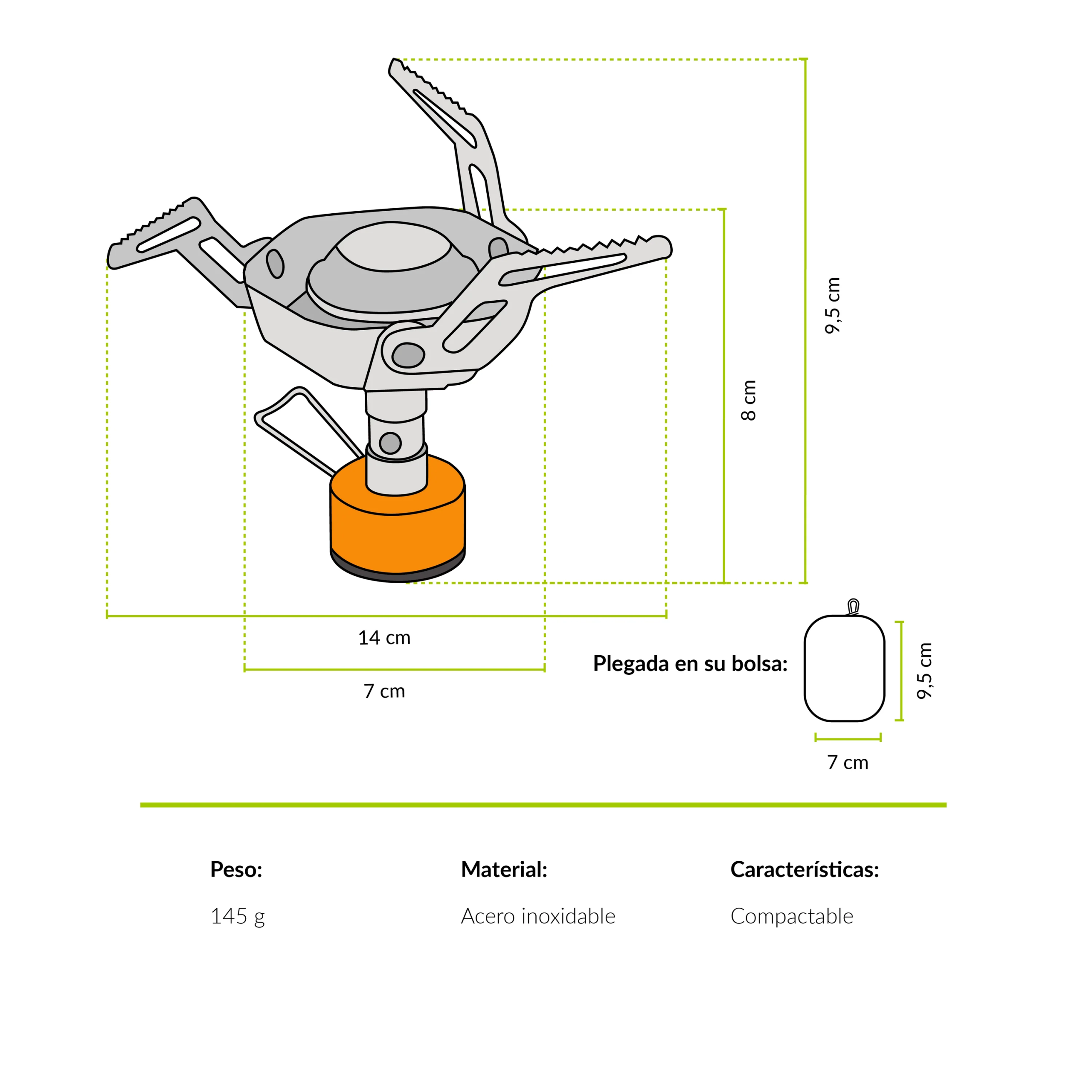 Cocinilla compacta perfecta para ir de trekking gracias a su tamaño. Su material de acero inoxidable y aluminio le entregan una larga vida útil, asegurando un funcionamiento seguro y resistente con una alta calidad.