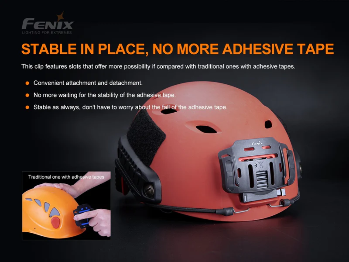 El clip para casco Fenix ALG-04 está diseñado específicamente para la fijación de linternas en cascos de trabajo industriales o para exteriores con base de montaje NVG. Acoplar el clip para casco ALG-04 de acuerdo con las ranuras. Permite acoplar y desacoplar fácil y convenientemente la linterna hacia y desde el casco, y permite ajustar el ángulo de iluminación.